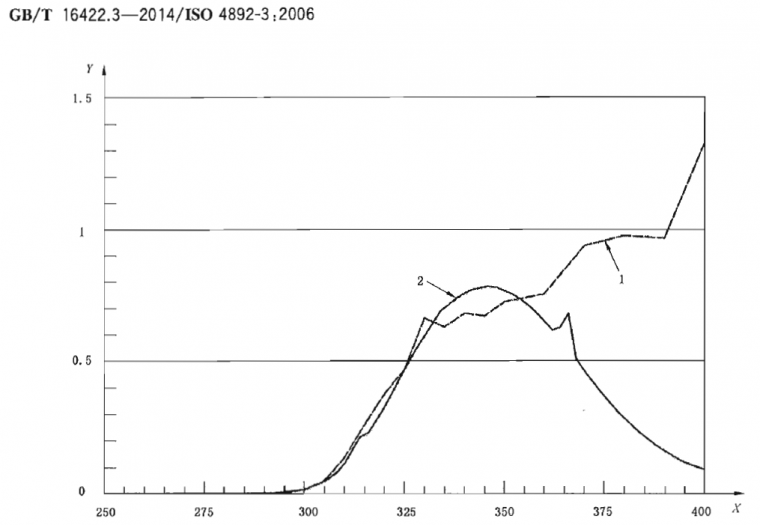 1B 型(UVA-351)熒光紫外燈:這種燈在300nm下的輻射低于總光能輸出的2%,在353nm有發射峰,用來模擬經窗玻璃后日光的紫外部分,這種燈通常被稱秋UVA-351(見表2)。附錄A中的圖A.2為250nm~400nm下典型的1B型(UVA-351)熒光燈對比經窗玻璃過濾后日光的光譜輻照度圖。2型(UVB-313)燈可在相關方協商同意下使用,但協商意見應在試驗報告中指出。