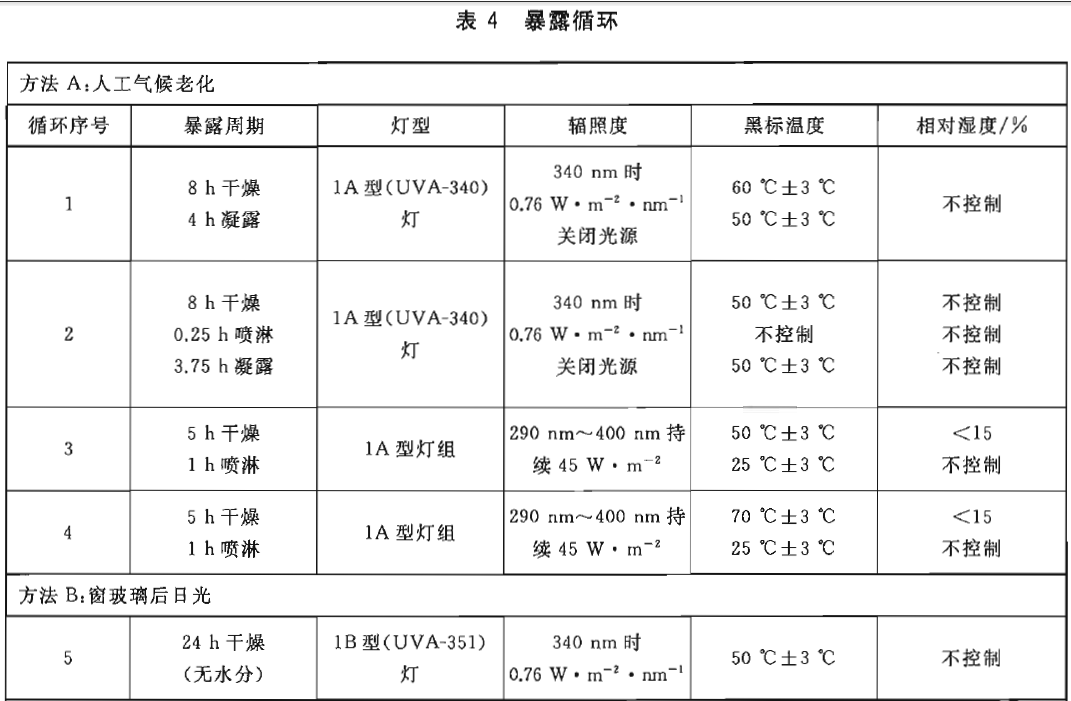 表4給出了人工氣候老化(方法A)、窗玻璃后日光(方法B)和2型(UVB-313)燈(方法C)進行試驗的多組暴露循環條件。